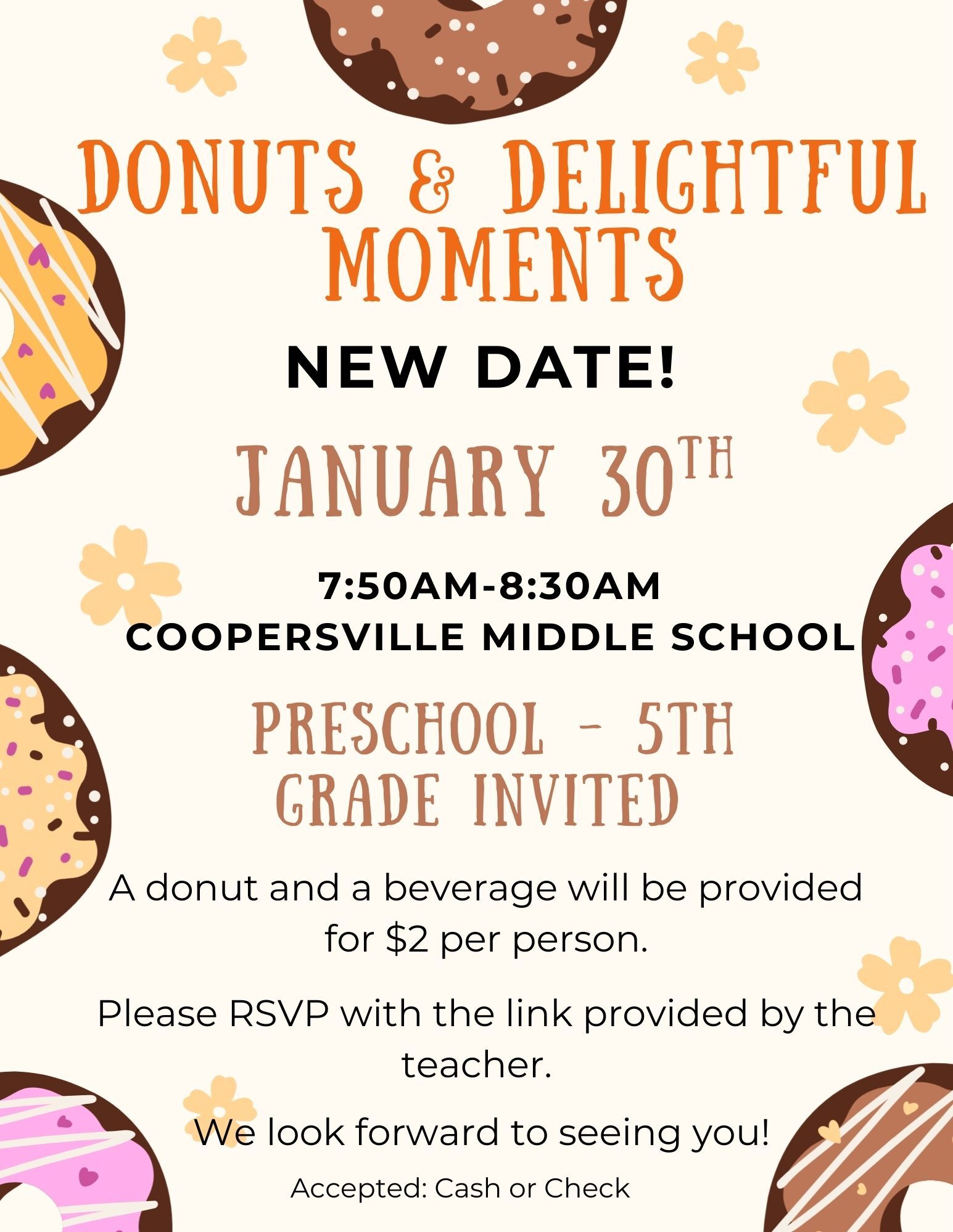 PTO Donuts & Delightful Moments 7:50 AM to 8:30 AMPTO Donuts & Delightful MomentsDate: Jan 30Time: 7:50 AM to 8:30 AMLocation: Coopersville Middle SchoolCost: $2Calendar: District Calendar