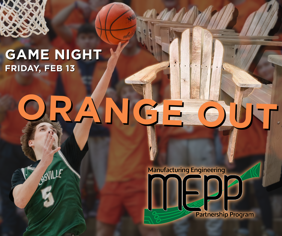 Join us on Friday, February 13 for an Orange Out at all varsity basketball games in support of the Manufacturing Engineering Partnership Program (MEPP). Fans are encouraged to wear orange, cheer on our Broncos, and enter to win a pair of handcrafted Adirondack chairs built by MEPP Woods II students. Celebrate school spirit, student craftsmanship, and hands-on career learning!