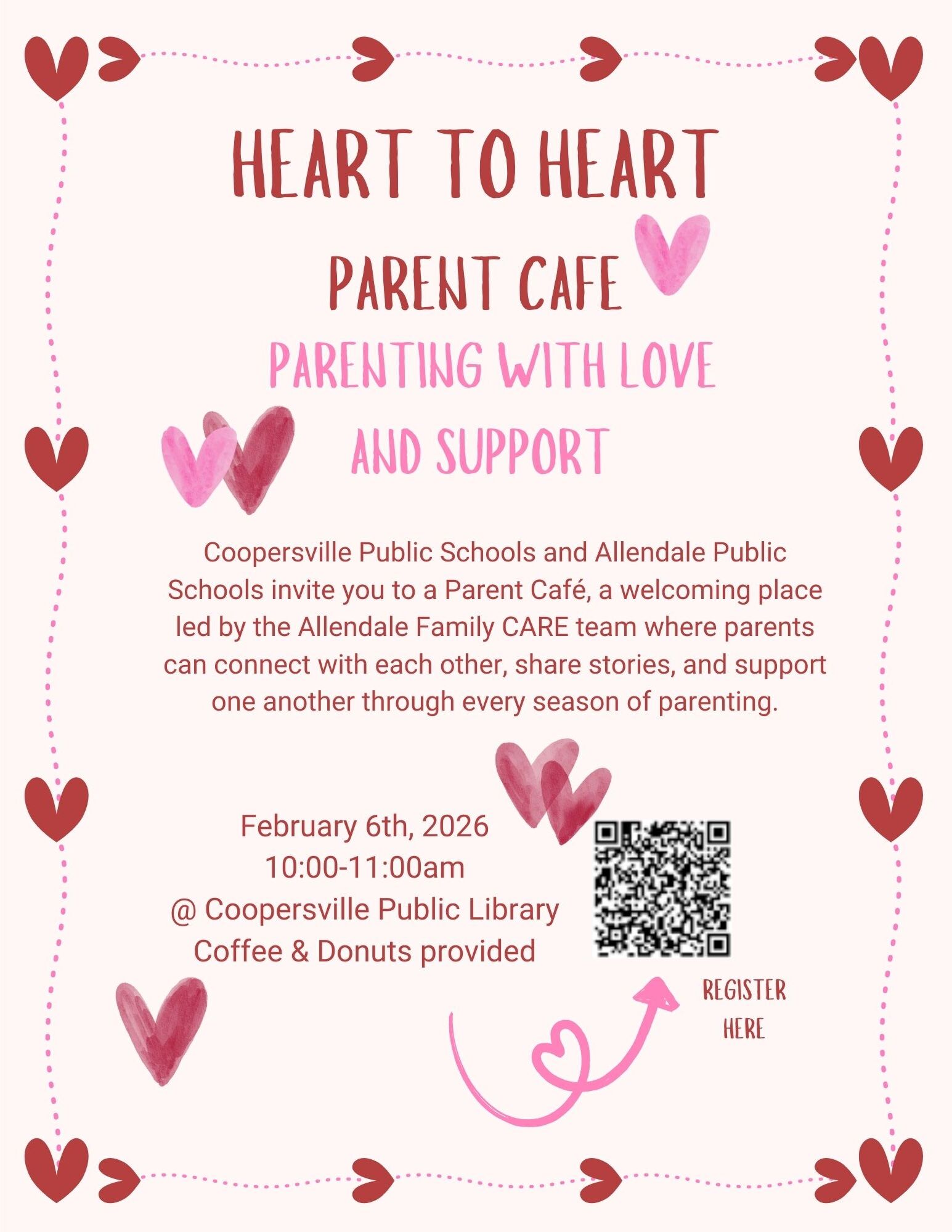 Coopersville Area public Schools and Allendale Public Schools invite you to a Parent Cafe, a welcoming place led by the Allendale Family CARE team where parents can connect with each other, share stories, and support one another through every season of parenting.