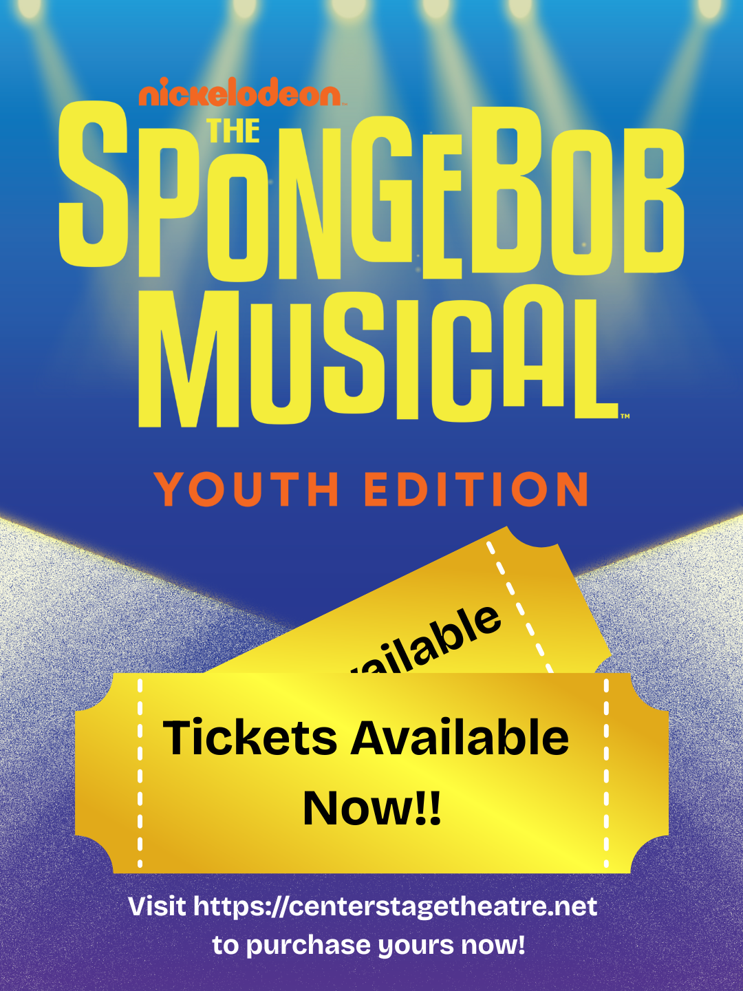 The Spongebob Musical Jr. 1:00 PM to 3:00 PMThe Spongebob Musical Jr.Date: Jan 31Time: 1:00 PM to 3:00 PMLocation: Centerstage Theatre, Coopersville High SchoolCalendar: Centerstage Theatre